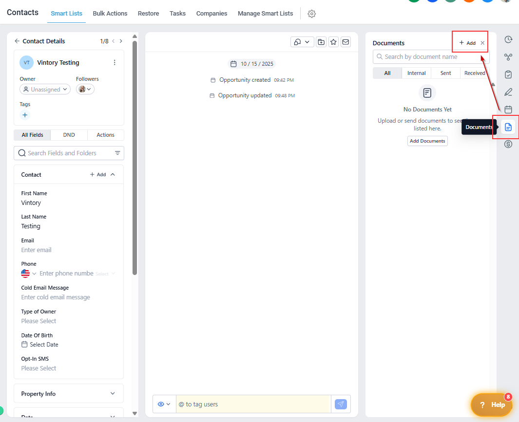 - On the right side of the contact card, locate the Documents field.