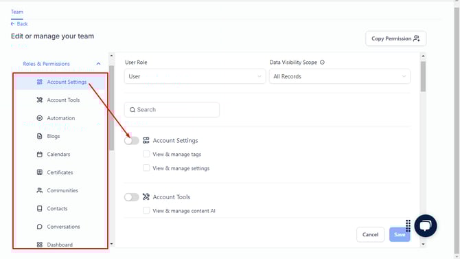 - Under Roles and Permissions you can assess the user's job role and decide which areas they need access to edit. Just toggle the radio button on for desired permissions and hit Save.