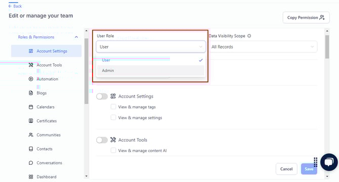 - If the user is assigned as a User, they will only have access to the permissions set at the top.
