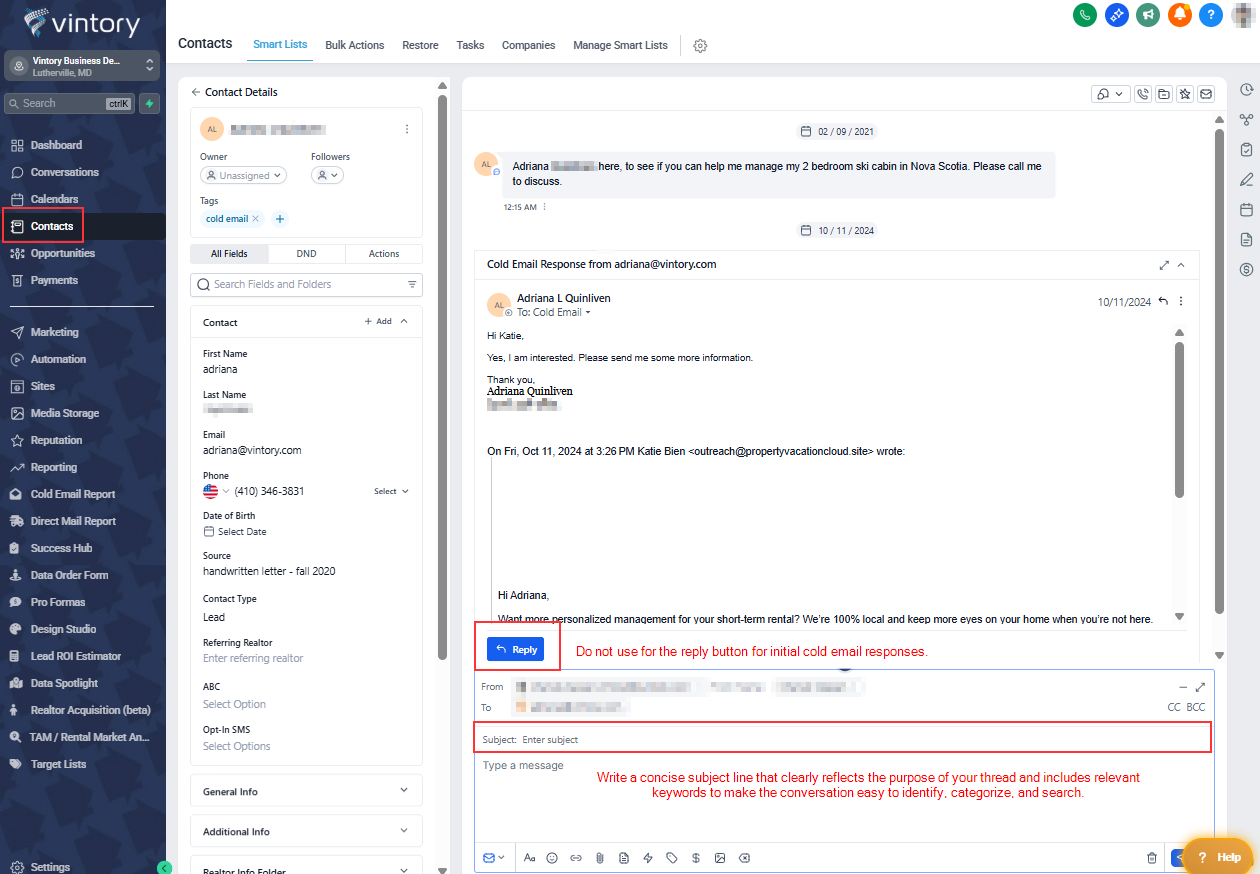 - Create new email thread - Cold Email Campaigns are not sent from within the CRM and instead imported in when a reply occurs so you have to start a new thread. The Repy button will NOT allow you to send an email.