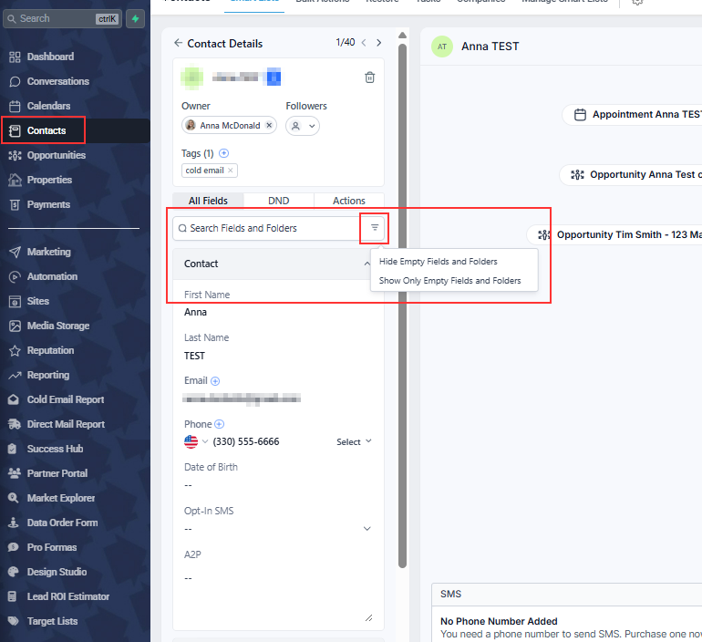 - Click on a contact to view their Contact Card, which contains comprehensive details about the owner and property.