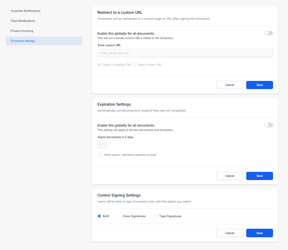 - Upon completion of signing the document you've sent, the contact can be redirected to a different URL such a Thank You page or a section on your site that requires further information.