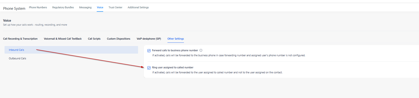 - Option 1: Route the calls to the user assigned to the called number (under My Staff > Call & Voicemail Settings) To do this, check the box next to the Ring User assigned to called number field.