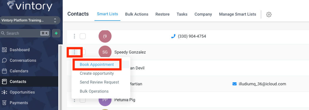2. Locate the Contact you wish to set the appointment. To the left of the Contact, click on the 3 dots and select Book Appointment.