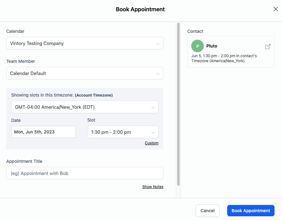 3. A new window will appear. Complete the appointment details. First, select the correct calendar from the dropdown that’s integrated in the platform. Update the date and time and input the appointment title. Add any additional notes if needed by clicking on Show Notes. Expand the Additional Preferences section to customize the Meeting Location and Appointment Status. Once complete, click Book Appointment.