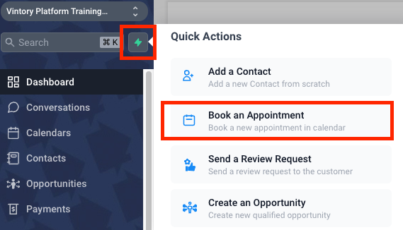 Click the Quick Actions button next to the Search bar and click Book an Appointment.