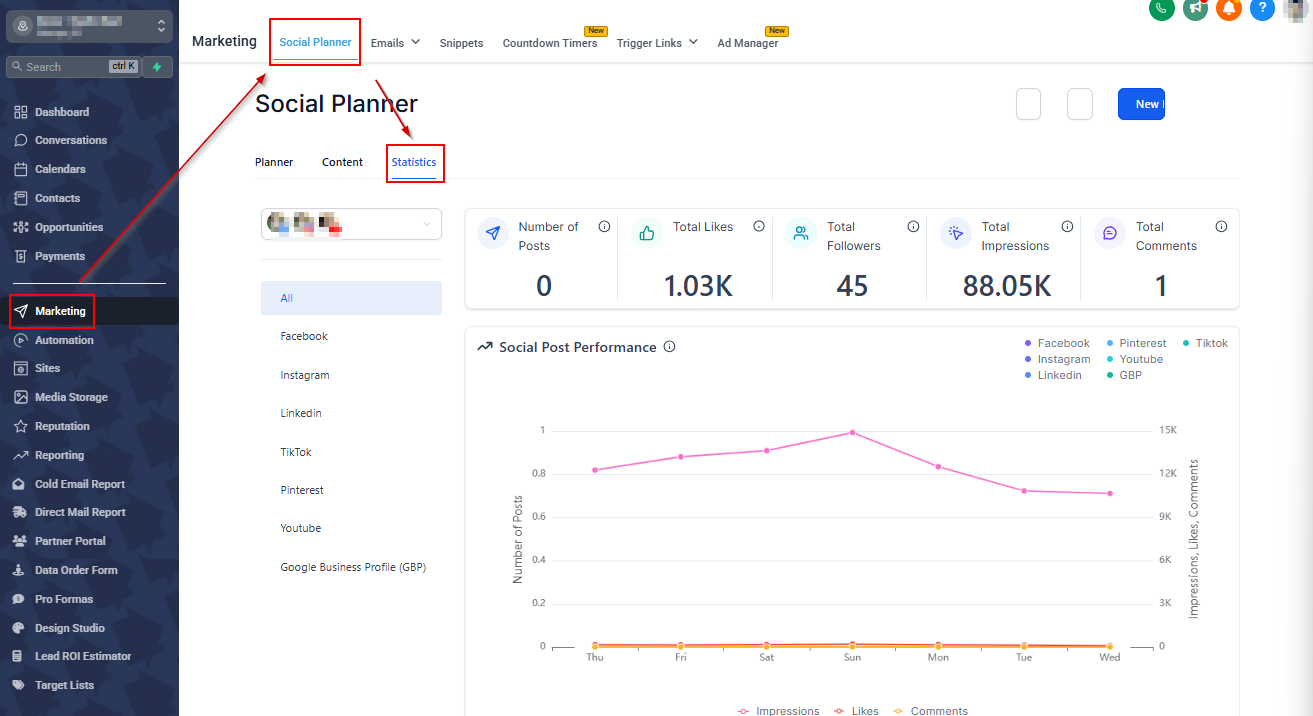 In your account, Navigate to Marketing > Social Planner > Statistics