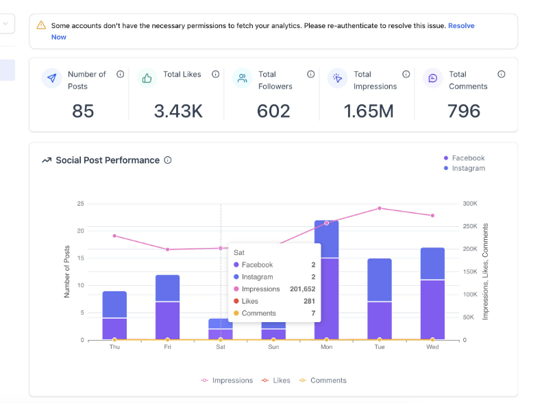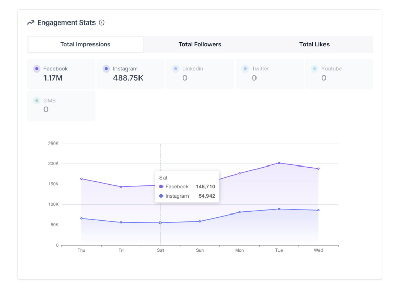 - Track the number of posts, likes, comments, followers, impressions, and reach across both Facebook and Instagram.