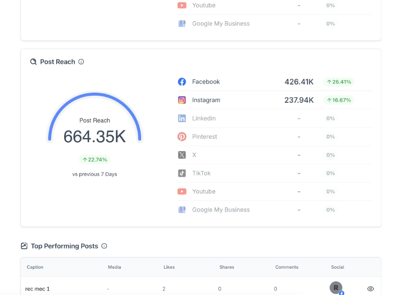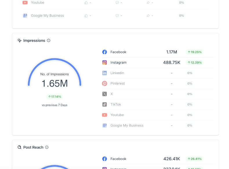 - Analyze your Post Reach to understand how far your posts are spreading and which platforms are driving higher reach.