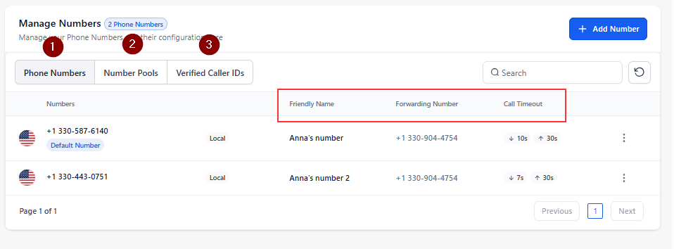 - Select the Phone Number under Phone Number Tab (Image labeled - 1) for which you want to use your phone number as caller ID.