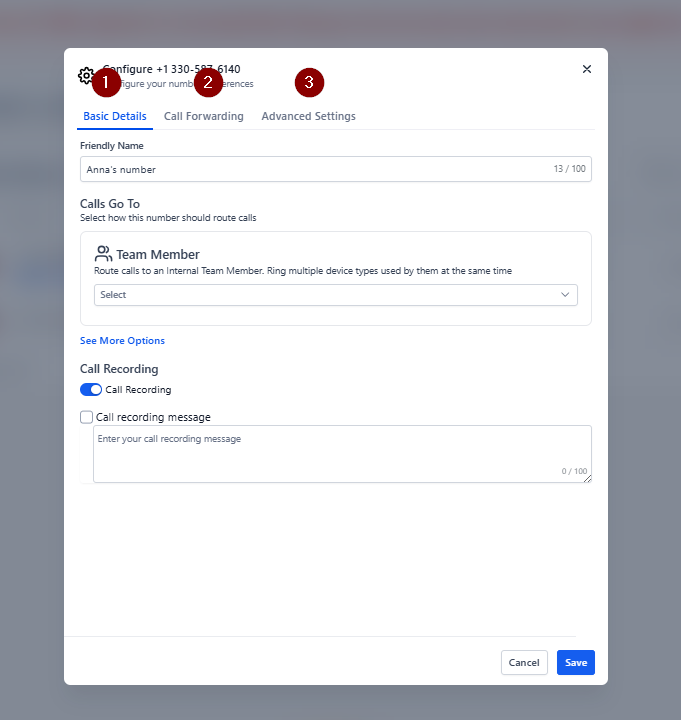 - Here you can select how this number should route calls and which team member it should be routed to. (1st Priority)