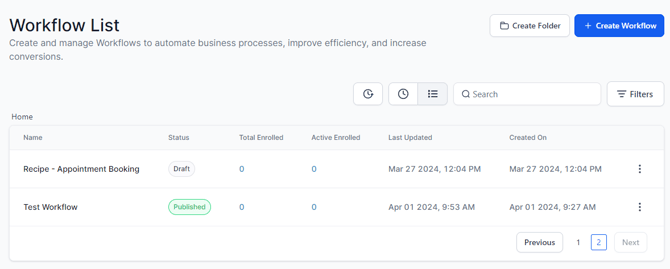 When viewing the workflow list, you will easily identify the workflow that has already been published or Drafted.