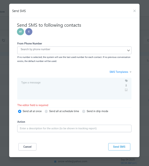 Note: If the contact does not have a phone number saved, there will not be an option to send SMS messages.