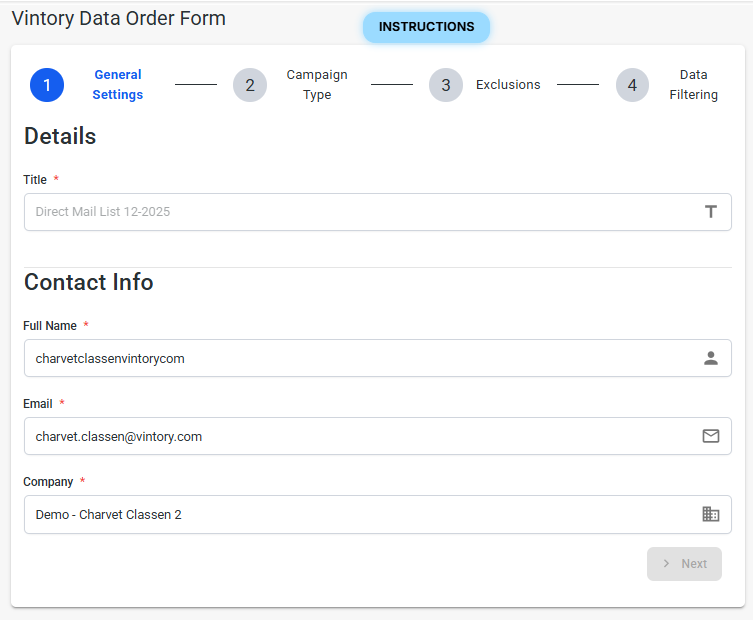 These fields should auto-populate with your account details. Be sure to enter a title before proceeding to the next step. An example title could be "January 2025 STVR".