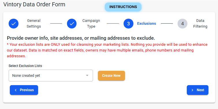 Your exclusion lists are ONLY used for cleansing your marketing lists. You can select to either exclude data records from your data order form between Site Addresses or Owner Info. For site addresses, all fields are required. For owner info, you must provide either a First Name + Last Name, Full Name, Email, or Phone Number for the row to be valid.